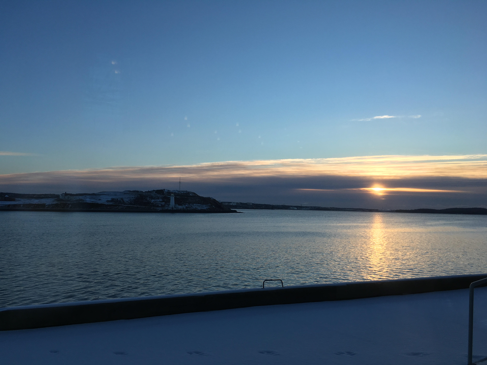 Of late, I have been aware of storing up beauty….beauty of all sorts. Sunrise at the harbor; the conversation with a stranger on the street about her hat; people marching in peace; people encircling mosques here in Halifax as well as in Quebec and Montreal so that prayers could go on in peace inside; the kissy, jowly, reunion joy of the dog in the back of the SUV ahead of me, parked at the curb at the airport; the exquisite beauty and perfection of metaphor in the writings of a newly discovered author; The friend who wrote so honestly and simply, “I often find myself in love, particularly when people are living with passion and authenticity…”; The smell of sautéing onions, garlic, cumin, cayenne, and tomato paste that forms the base for red lentil lemon soup; the clean line of a fine point pen on a fresh sheet of paper; the swell of full bodied Gospel music and opera arias and dancing to old-school Rock in the kitchen.