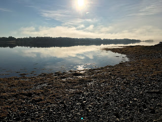 The fog has dissipated and the clouds have thinned to nearly translucent. there is a kind of white shine upon the water. As though she’s dressed in evening finery.