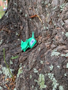 Walking home through Victoria park later in the afternoon, I noticed that someone had taken what looked like a bit of envelope, made an origami animal, and tucked it into the nook of a tree.