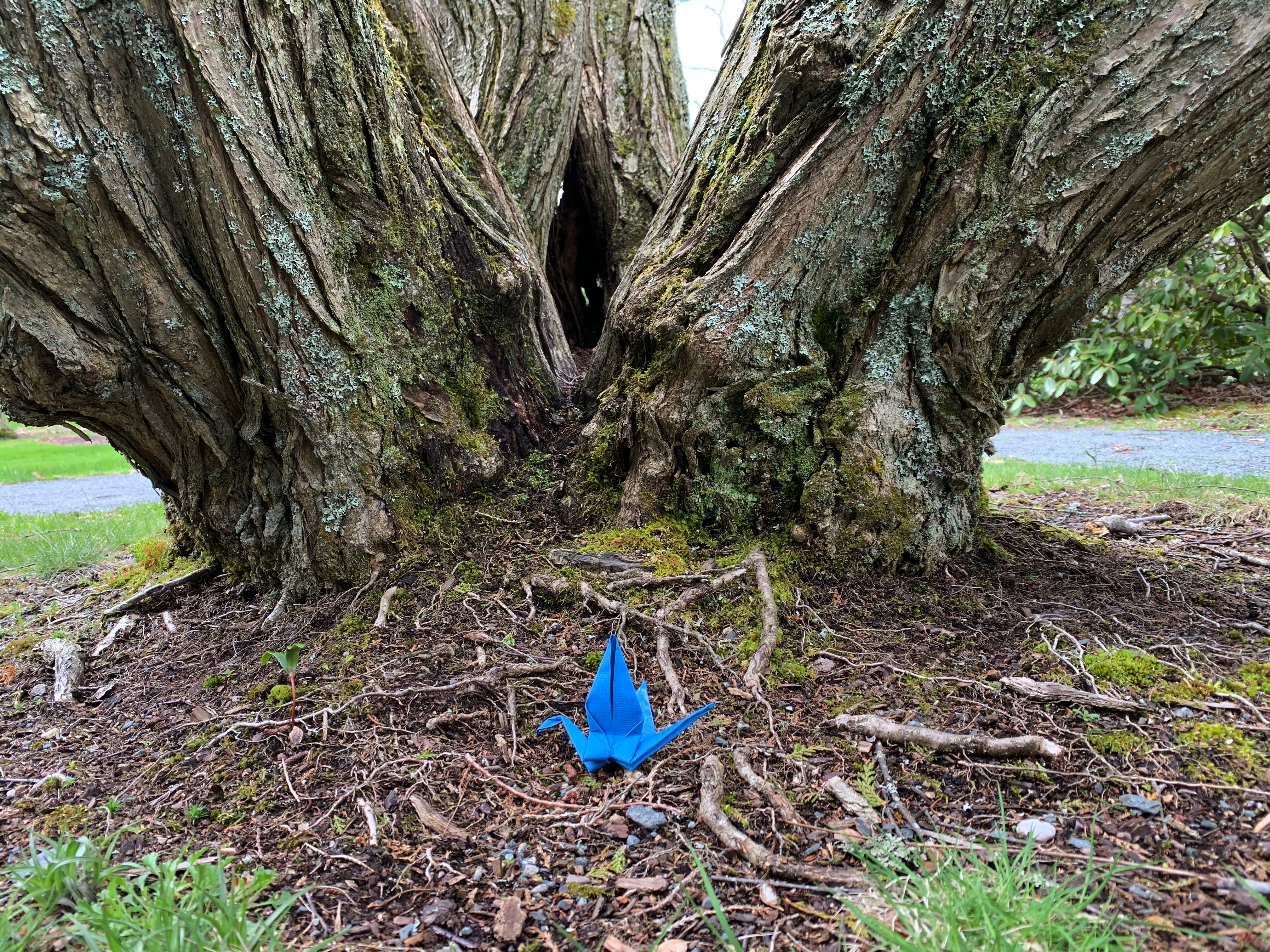 You can’t read it in the photo, but this blue origami crane, folded by Someone, had a little tag that says “You found me!” And I found it at the confluence of earth and sky…where root and branch meet.