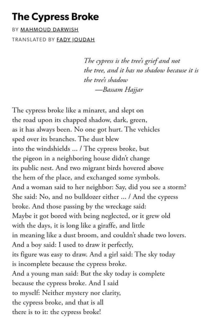 …And a girl said: The sky today/is incomplete because the cypress broke./And a young man said: But the sky today is complete/because the cypress broke. And I said/to myself: Neither mystery nor clarity,/ the cypress broke and that is all/there is to it: the cypress broke!