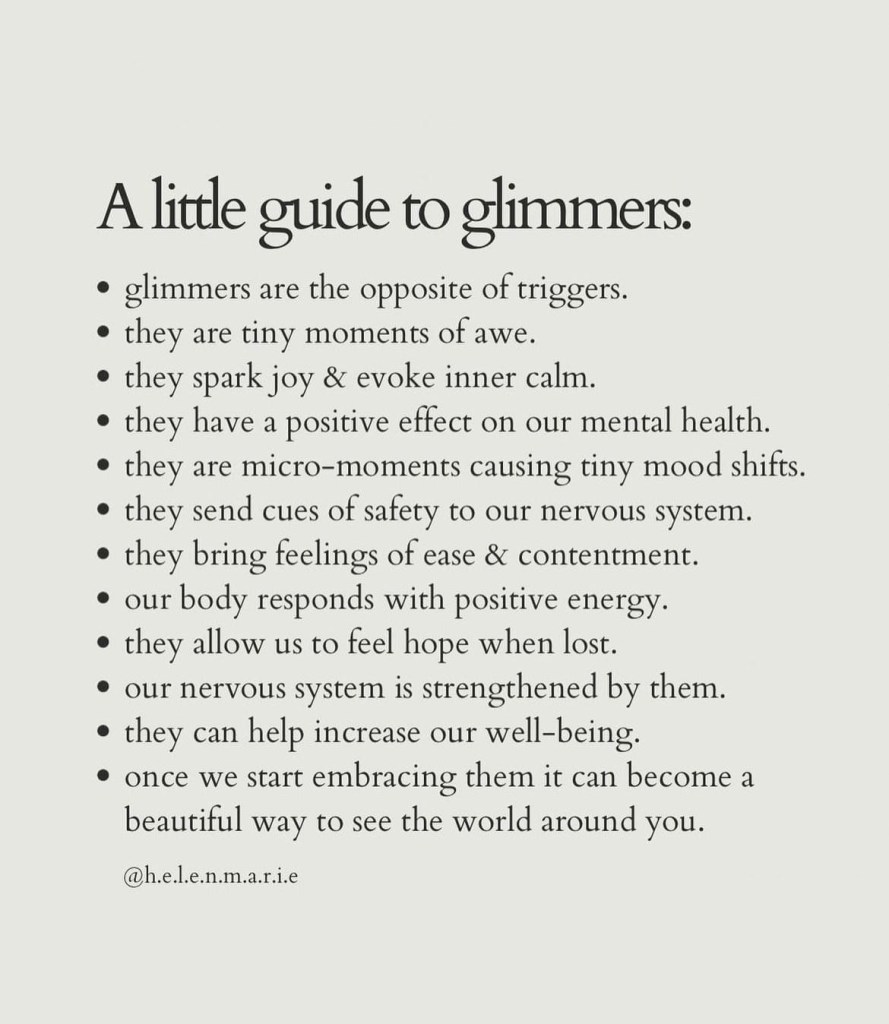 When I saw this list of Glimmer qualities, that’s what I thought of. People who by their being quietly bring about an equilibrium, a fullness, steadiness, a sense that Oh…oh this is different…simple and organic…and a bit indescribable and I like it very much and maybe it is passing, but now I know of it and I too walk with it inside of me…thanks to this experience.
