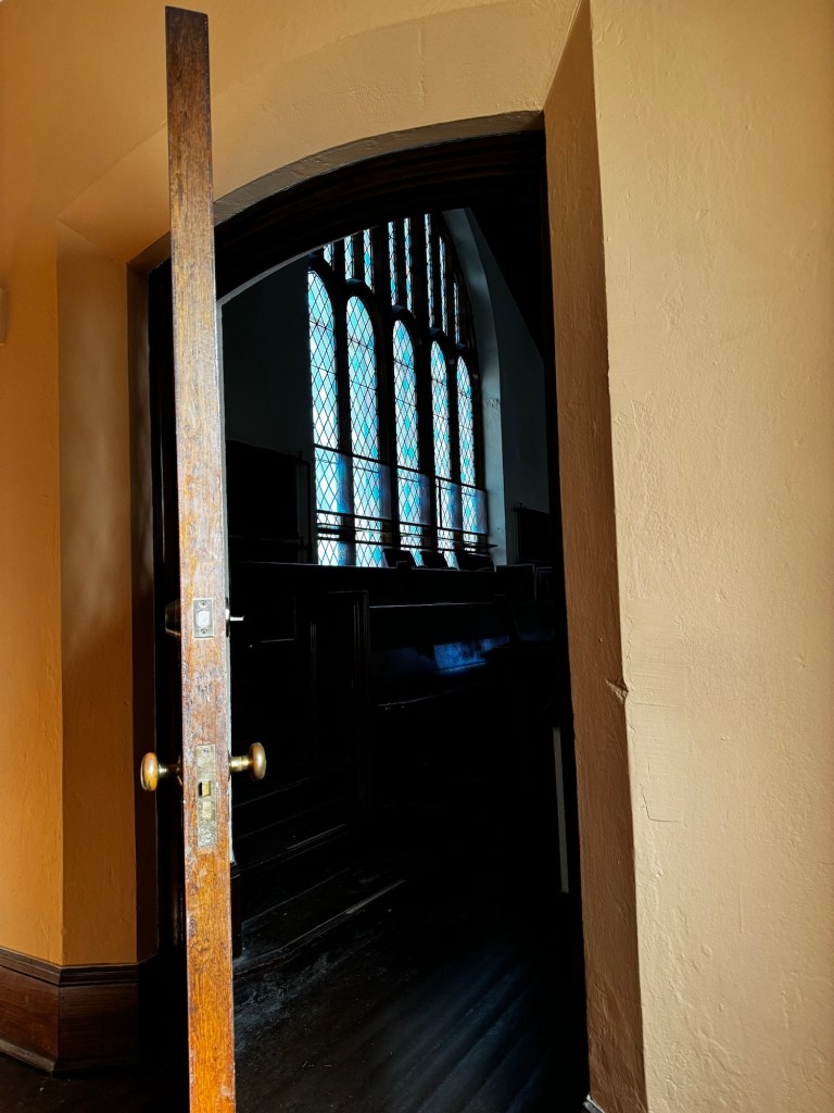 Went up to the balcony as I had wanted to… The time of day was perfect, and the day itself—still full of light even at the sighing time when sun prepares to exchange the vigil with moon. First thing I noticed was the temperature shift when walking through the doors—so sudden. Where the sanctuary is of warm dust and candles, the stairwell going up is cool dust and light—at least right now. The light is incredible—sunset yellow-orange. There is also a palpable sense of age, the smoothing of time that has softened the wood’s surface and settled into the cushions on the pews that are still up here. And again, the dust…the dust that glitters gold in the stained glass filtered light.